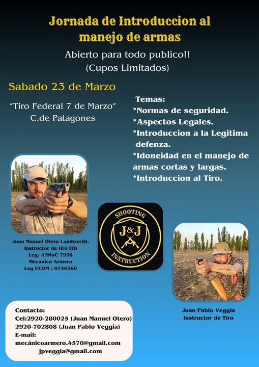 Este sábado se realizará en Tiro Federal 7 de Marzo una capacitación sobre manejo responsable de armas. Estará a cargo de Juan Manuel Otero y Juan Pablo Veggia.