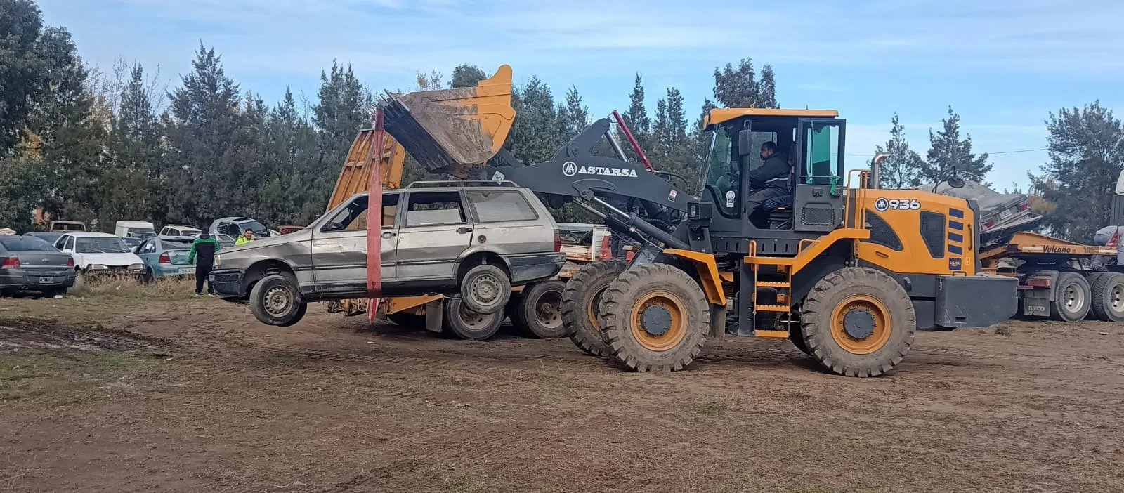 El equipo vial trabajó con un batea, un camión con acoplado y el camión con el carretón, realizando dos viajes con el carretón, dos con la batea y dos con el camión con acoplado para completar el operativo.
